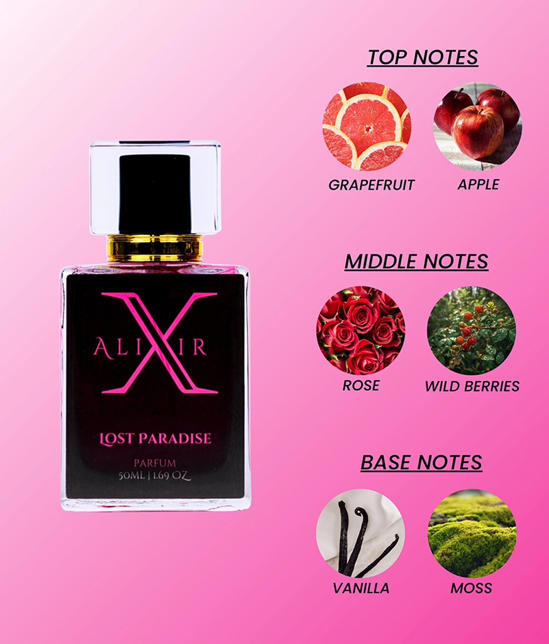 White florals and rose unfold with wild berries, creating a smooth, warm sweetness that feels close, tender, and subtly seductive.